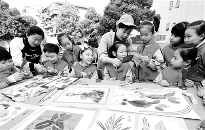 10月31日,安徽省安庆市大观区德宽路二小学生在老师指导下制作树叶贴画。连日来,大观区教育部门倡导各小学开展学生社会实践活动,在城市公园、湖边景观带等地开设第二兴趣课堂,组织小学生一边欣赏秋景一边捡拾落叶,用色彩斑斓的树叶剪贴成一幅幅富有创意的图画,留下秋天的记忆。黄有安 项顺平 摄
